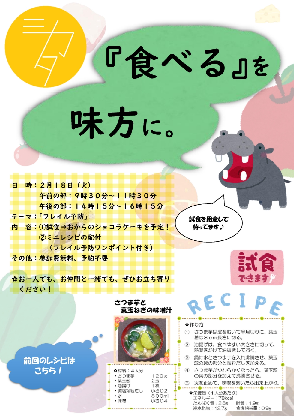 「フレイル予防」をテーマに試食会を行います。試食は、「おからのショコラケーキ」を予定! ミニレシピも配付 (フレイル予防ワンポイント付き)します!お一人でも、お仲間と一緒でも、ぜひお立ち寄りください!